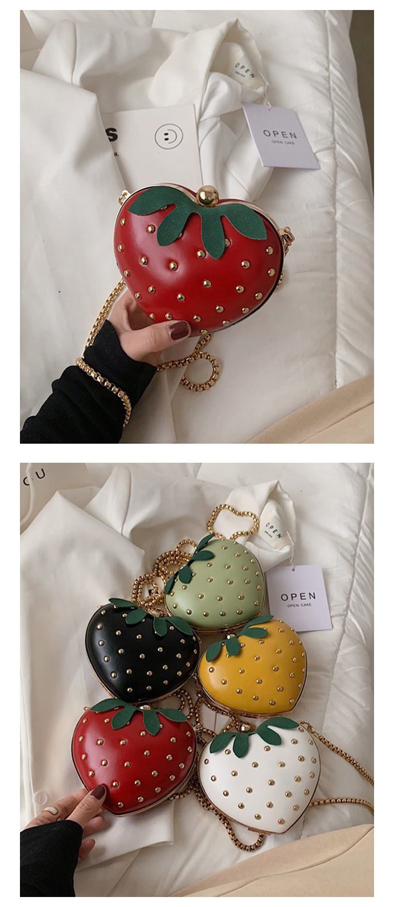 キュートないちごの形をしたレディース向けミニバッグ。表面に散りばめられた小さな飾り鋲が特徴的で、遊び心あふれるデザインが魅力です。