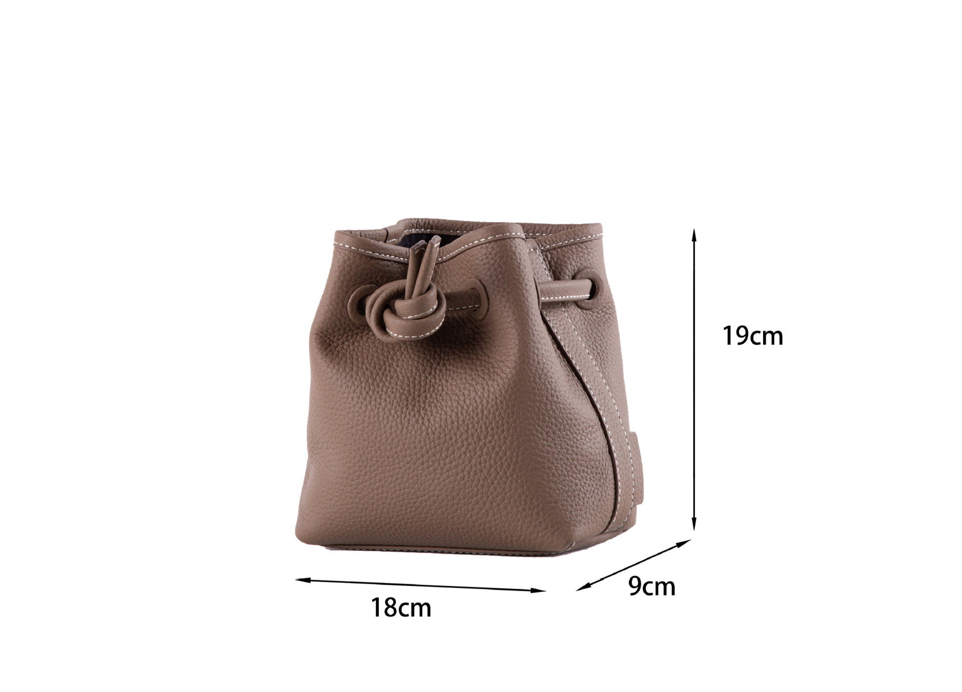 柔らかなレザー調素材を使用し、巾着部分の紐がデザインのアクセントになっています。