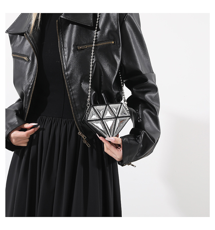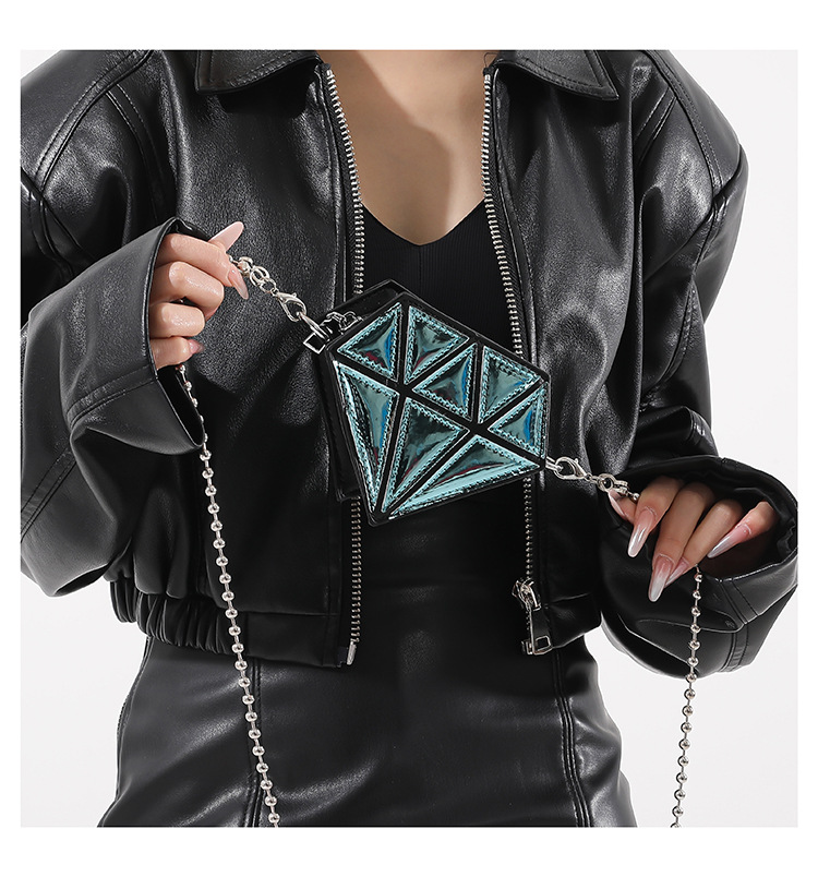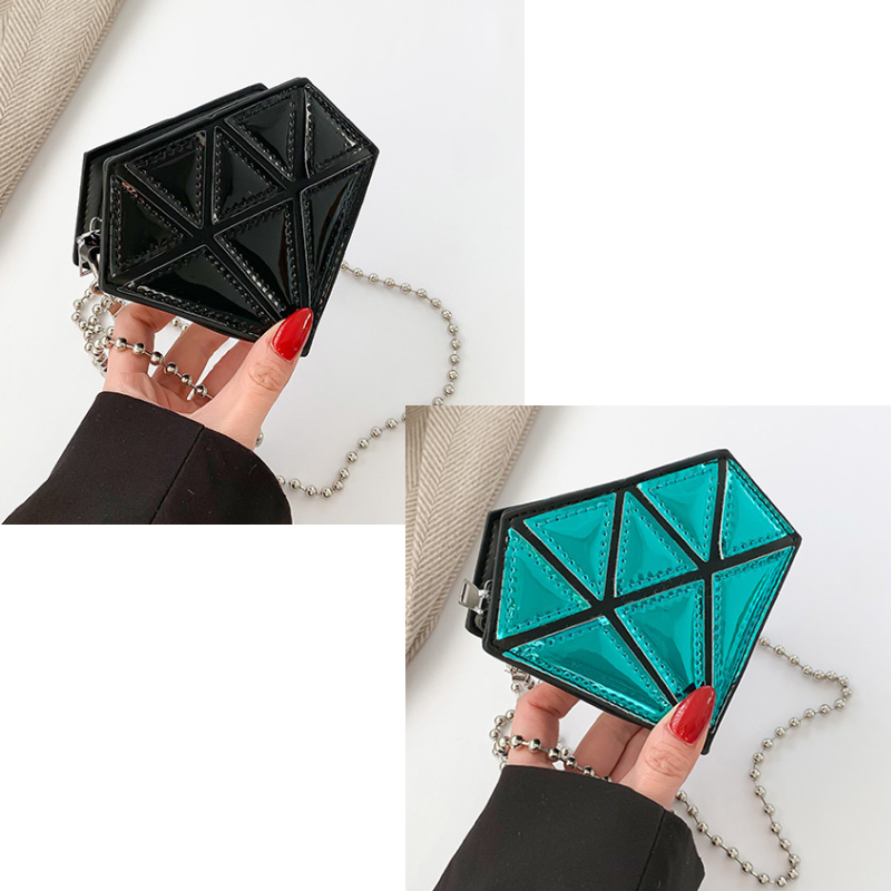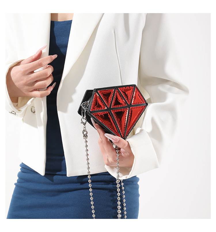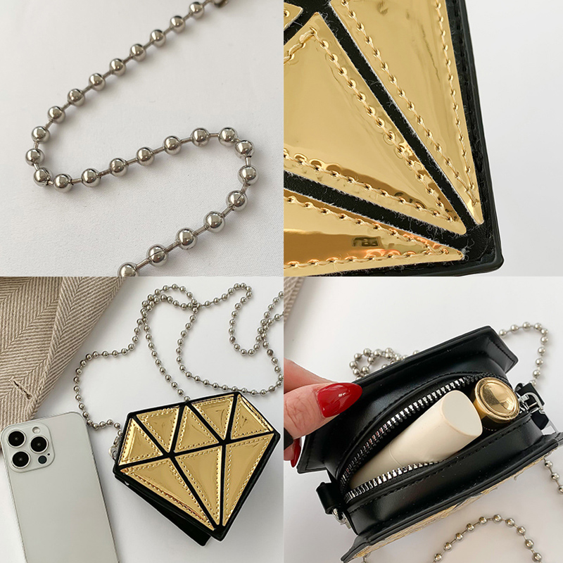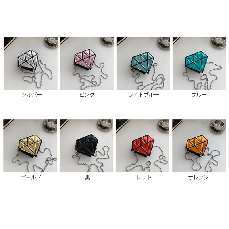 ■コメント ・アクセサリー感覚で持てるミニバッグです。 ・本物のダイヤのようにキラキラと輝き綺麗です。 ・120gと軽量で肩への負担が少ないです。 ・鍵など小さなものが収納できます。 ・ユーモア溢れるアイテムです。 ◆サイズ(cm) 幅13、高さ11、マチ5.5/ショルダーチェーンストラップ長さ104/120g ■カラー 画像に記載 ■素材 合成皮革